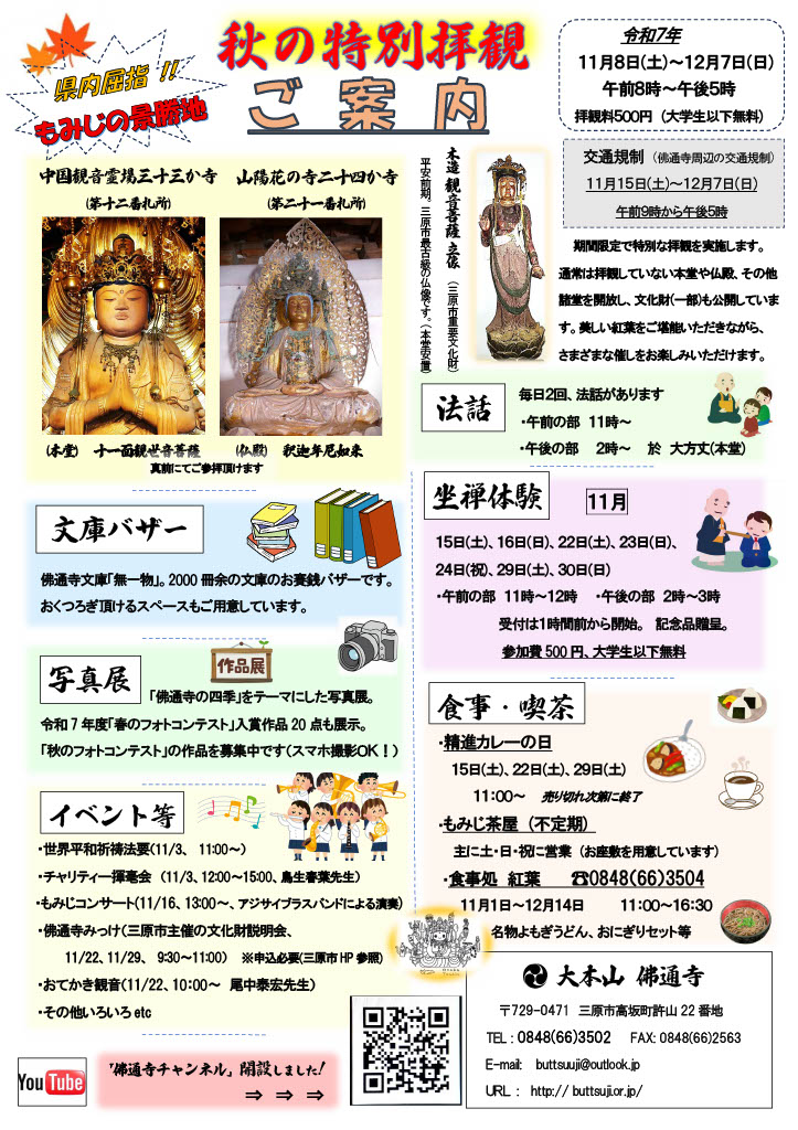 ⑥イベント 世界平和法要、もみじコンサート、お手書き観音(尾中泰宏先生)他